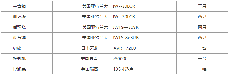 音箱器材全部選用了美國(guó)頂級(jí)的家庭影院音箱品牌亞特蘭大,從30年前建廠伊始,該廠自我要求標(biāo)準(zhǔn)是要「重現(xiàn)真實(shí)」,并特別強(qiáng)調(diào)的有四大要素,包括(一)清晰的對(duì)話與音效(二)橫跨整個(gè)銀幕及各個(gè)方向的精準(zhǔn)定位與移動(dòng)(三)有說服力的逼真包圍感(四)強(qiáng)勁快速又結(jié)實(shí)飽滿的低頻能量。使用該品牌作為家庭影院音箱,實(shí)乃享受頂級(jí)影音效果的無他首選。與之匹配的DENON功放也是功放產(chǎn)品界頂尖品牌,無論從整體設(shè)計(jì)到細(xì)小環(huán)節(jié),無處不為用戶得到最佳體驗(yàn)考慮到極致,合并式功放的搭配也可以輕松實(shí)現(xiàn)坐擁時(shí)下最頂尖杜比7.1聲道解碼,并且調(diào)校方便,操作簡(jiǎn)易,對(duì)擴(kuò)聲方面的要求做到一步到位。