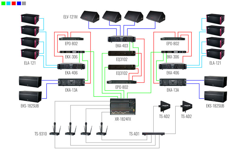 我司為小型戶外演出提供如下擴聲系統解決方案,本套小型戶外演出方案由得勝ELA線性陣列音箱搭配得勝EKS-182SUB超低音音箱,配套EKA系列專業功放、EP0-802電源時序器、EQ3102均衡器、EKX-306處理器等設備組成,通過全頻線陣音箱和超低音揚聲器來實現完美的擴聲效果,在實際應用中具有水平覆蓋均勻、垂直指向性強,輻射區內聲能衰減較小等實用的特點,滿足小型戶外演出擴聲中觀眾區對音質的足夠聲壓級,語言清晰、可懂度高,有豐滿度和層次感要求。我司為小型戶外演出提供如下擴聲系統解決方案,本套小型戶外演出方案由得勝ELA線性陣列音箱搭配得勝EKS-182SUB超低音音箱,配套EKA系列專業功放、EP0-802電源時序器、EQ3102均衡器、EKX-306處理器等設備組成,通過全頻線陣音箱和超低音揚聲器來實現完美的擴聲效果,在實際應用中具有水平覆蓋均勻、垂直指向性強,輻射區內聲能衰減較小等實用的特點,滿足小型戶外演出擴聲中觀眾區對音質的足夠聲壓級,語言清晰、可懂度高,有豐滿度和層次感要求。